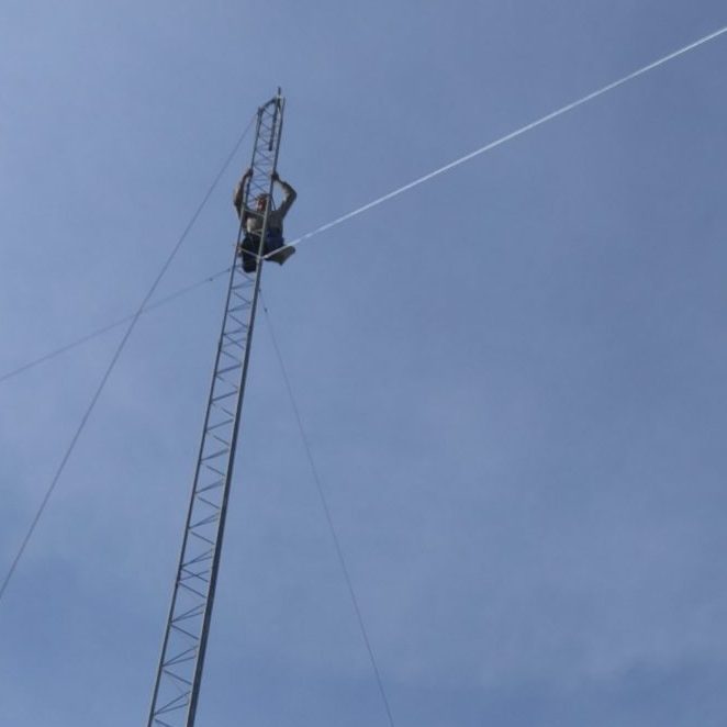 Next, we dug out for the foundation for the tower, and poured concrete to set it in place. After several weeks of waiting for the concrete to cure, we then enlisted the aid of our longtime tower climber, Leonard Smith, to help actually raise the tower. We did so section by section, 10 feet at a time, until we arrived at our final height of 55 feet.