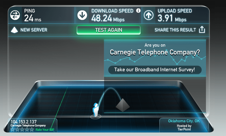 You’ve probably seen our guys working over in Fort Cobb the last few months. We’ve been taking our time to get the cable system upgraded and ready for serious speeds. This speed test from one of our test locations shows that we’re ready to offer some SERIOUS speeds to our customers. That’s right… 50 megabit/second service is available NOW to Fort Cobb.