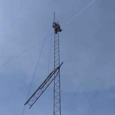 Next, we dug out for the foundation for the tower, and poured concrete to set it in place. After several weeks of waiting for the concrete to cure, we then enlisted the aid of our longtime tower climber, Leonard Smith, to help actually raise the tower. We did so section by section, 10 feet at a time, until we arrived at our final height of 55 feet.